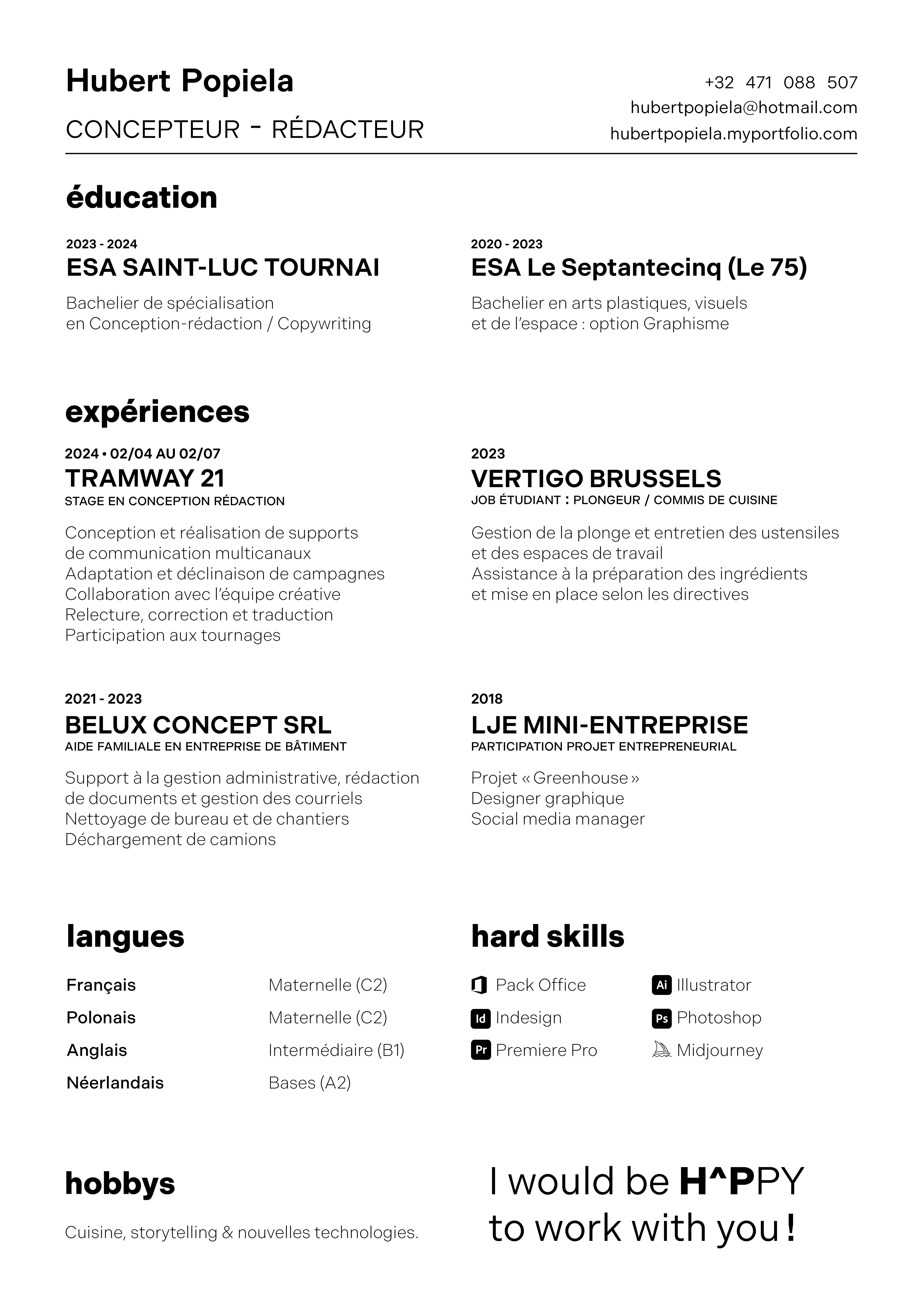 Si vous êtes arrivé jusqu'ici, c’est que vous êtes curieux d’en apprendre plus sur moi ! Ça tombe bien, junior concepteur-rédacteur est à la recherche d’un stage.