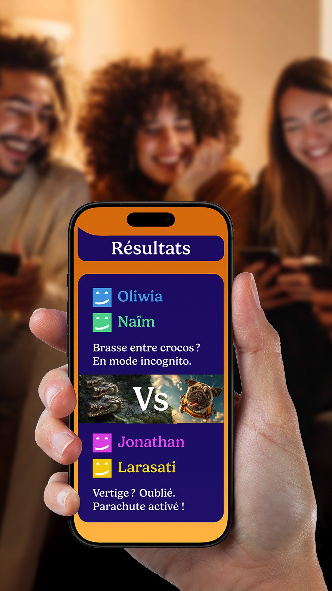Le jeu combine des questions du type « Tu préfères » (Chiens ou chats? ou Les vacances : à la plage, gravir l’Everest ou se perdre dans la jungle?) et des phrases à compléter, telles que « Mon talent caché, c’est… ». Dans le premier format, les participants voient les réponses des autres, ce qui déclenche naturellement la discussion, tandis que dans le second, chacun répond anonymement puis vote pour la réponse la plus drôle ou originale, révélant ensuite l’auteur.