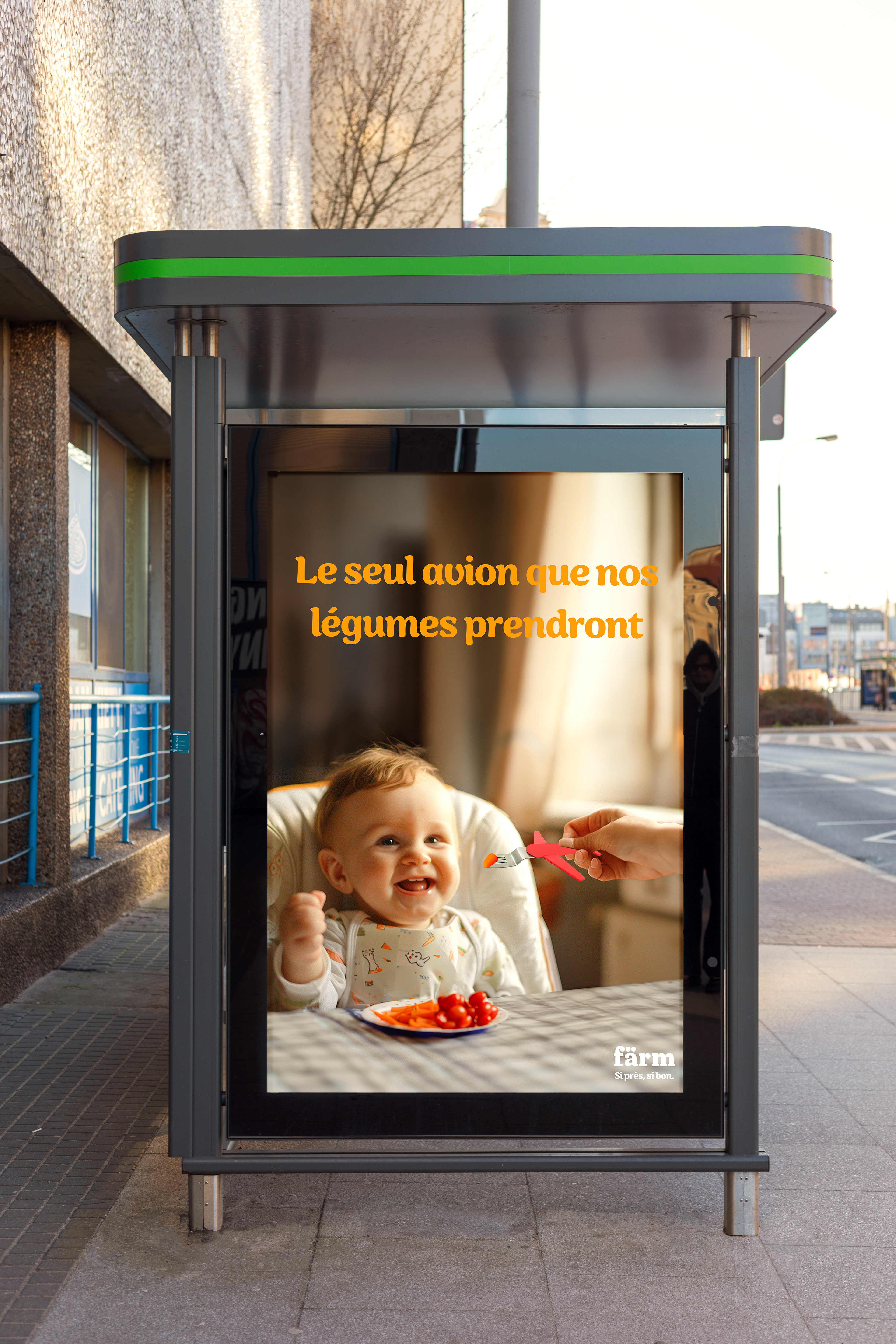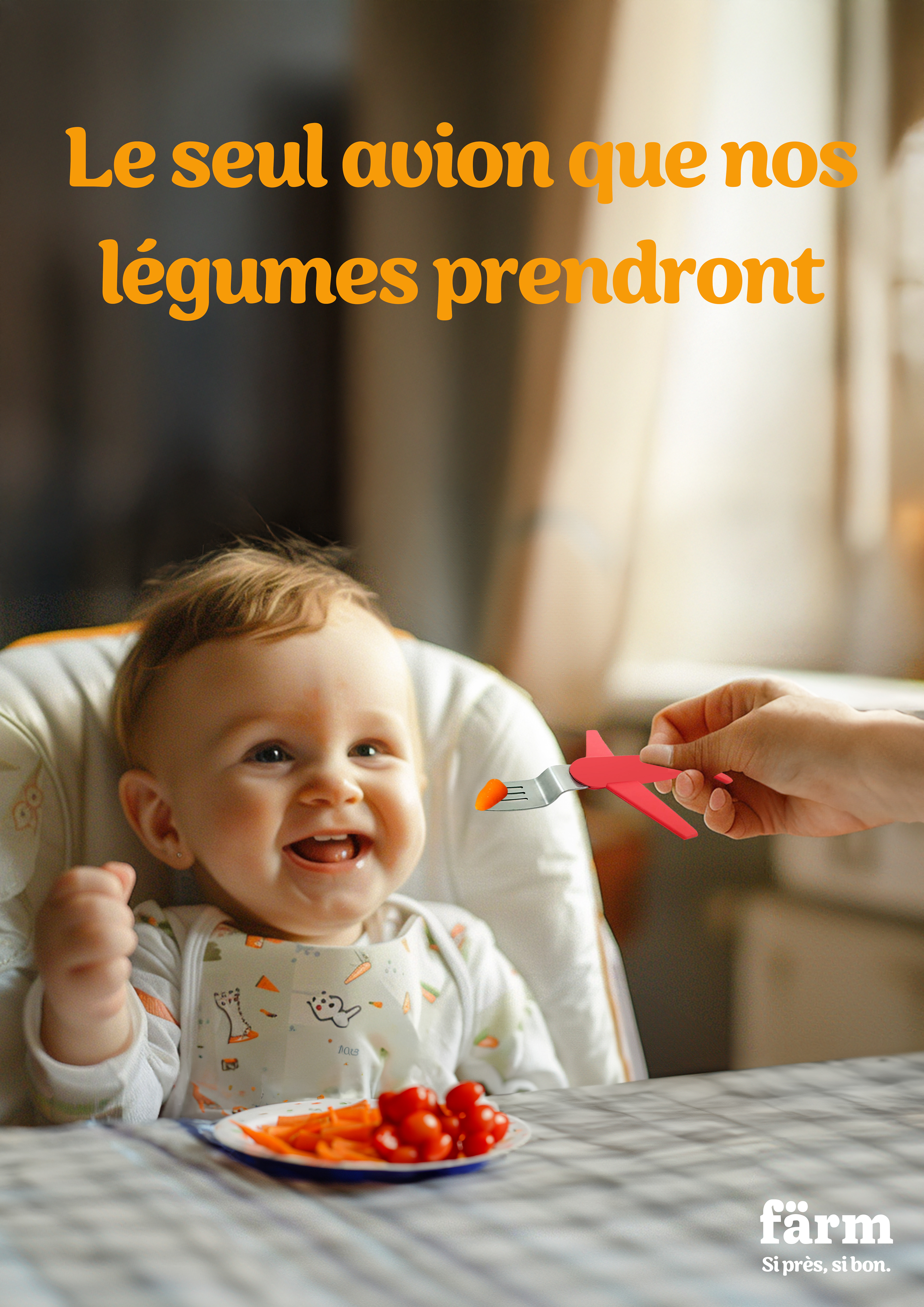 Idée : Puisque Färm privilégie les fruits et légumes locaux autant que possible, ceux-ci ne font pas de longs voyages. Leur seul grand trajet est celui qu’ils accomplissent lorsqu’un parent nourrit son enfant avec une fourchette en forme d’avion. Les bruits de moteur d’avion se limitent à des 'wwwww', 'zziiuuu' et 'hoop' (et bien d’autres), faits par les parents pour inciter les enfants à manger des fruits et légumes.